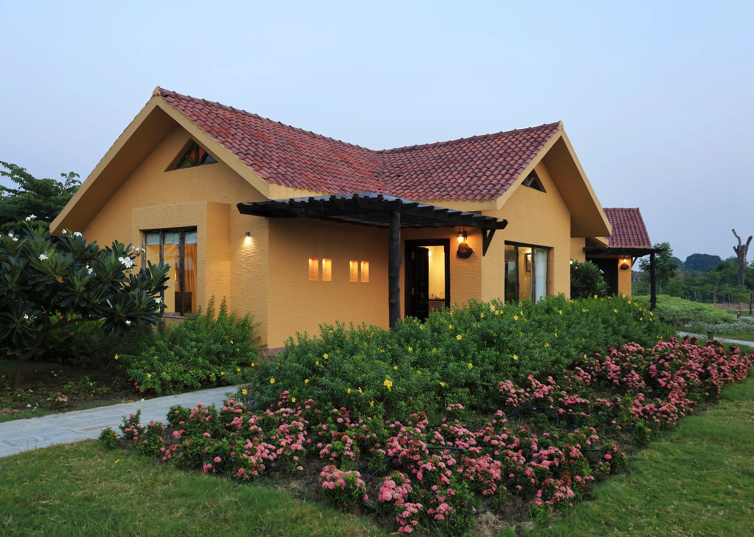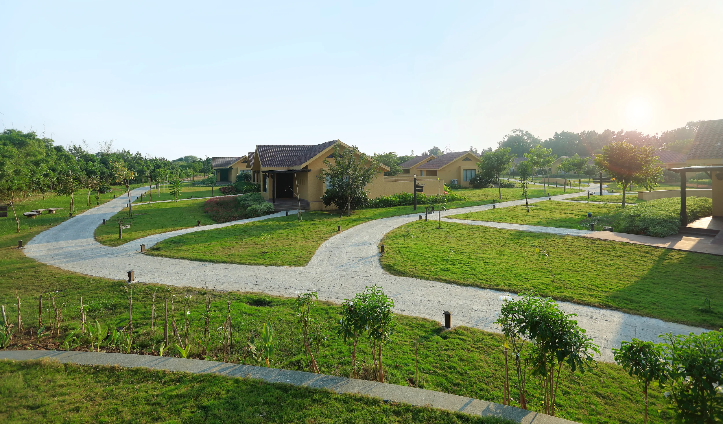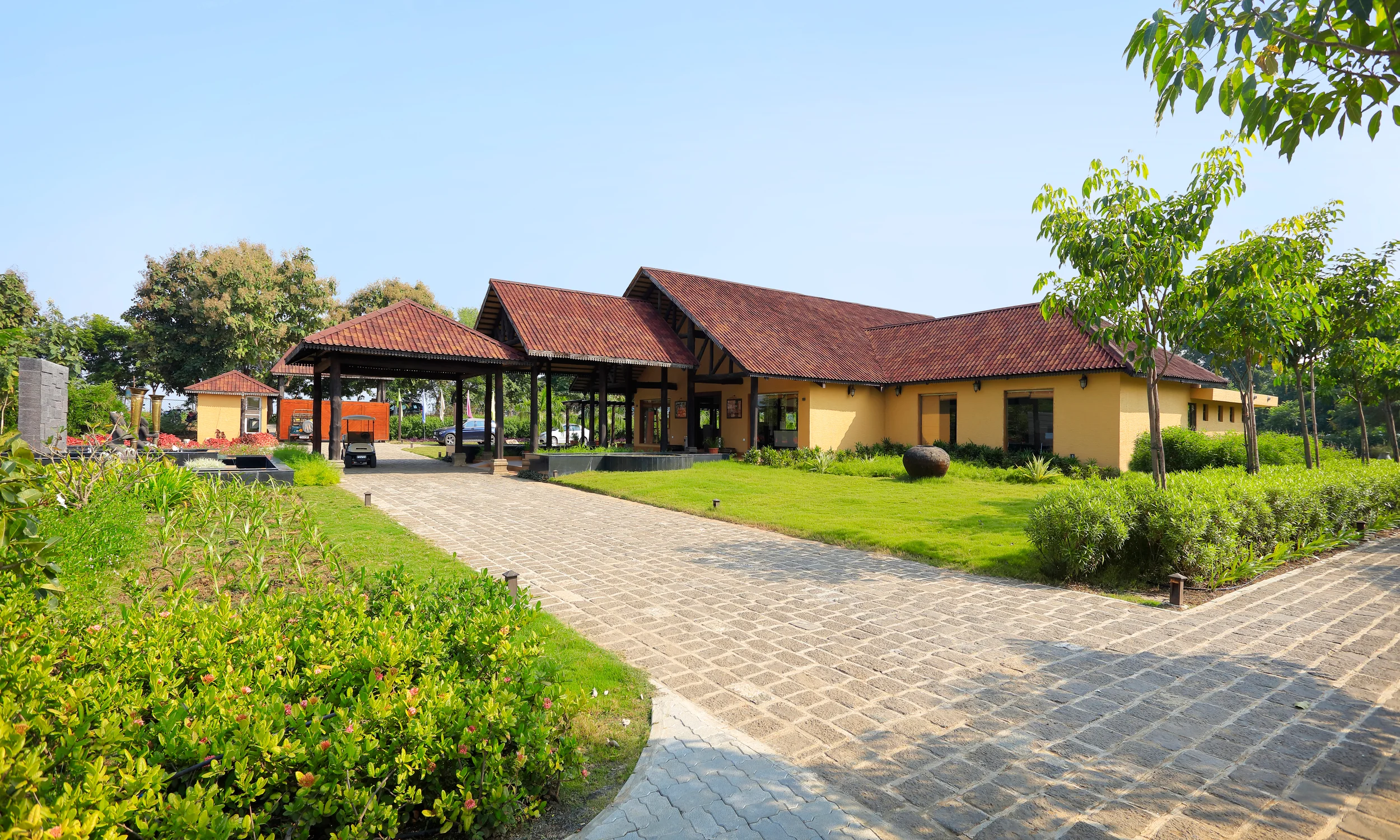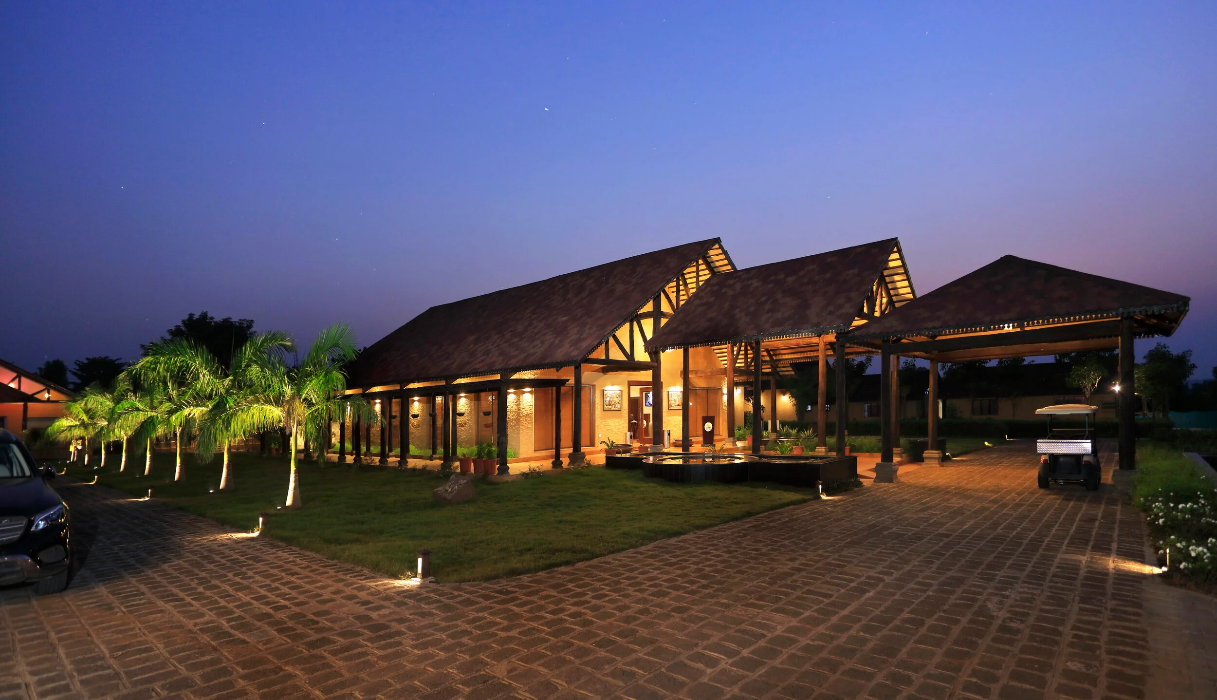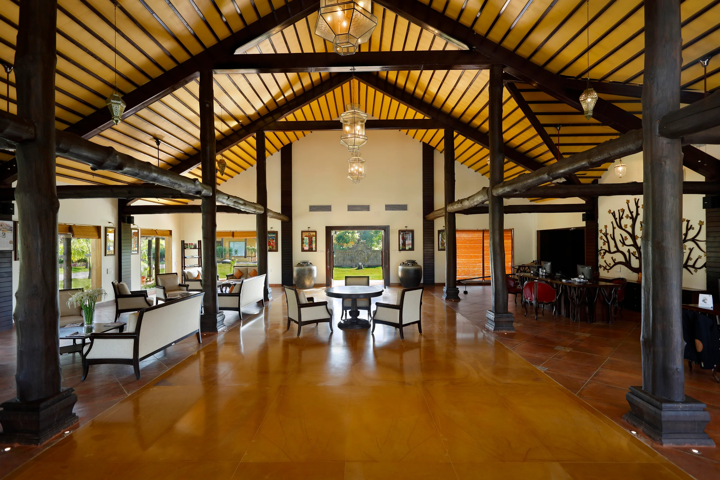 Located within 1.5km of Tadoba Forest, WelcomHeritage Tadoba Vanya Villas Resort and Spa (ITC) offers a luxurious retreat by blending rustic local traditional elements with modern elegance, the resort features a striking entrance lobby with a sloping roof and wooden post-beam structure. Local materials, stone pathways, and soft landscaping invite guests to explore the property leisurely, with warm lighting enhancing the wooden interiors. The involvement of the local community in the building process and the use of locally sourced materials add authenticity and a deep connection to the region.