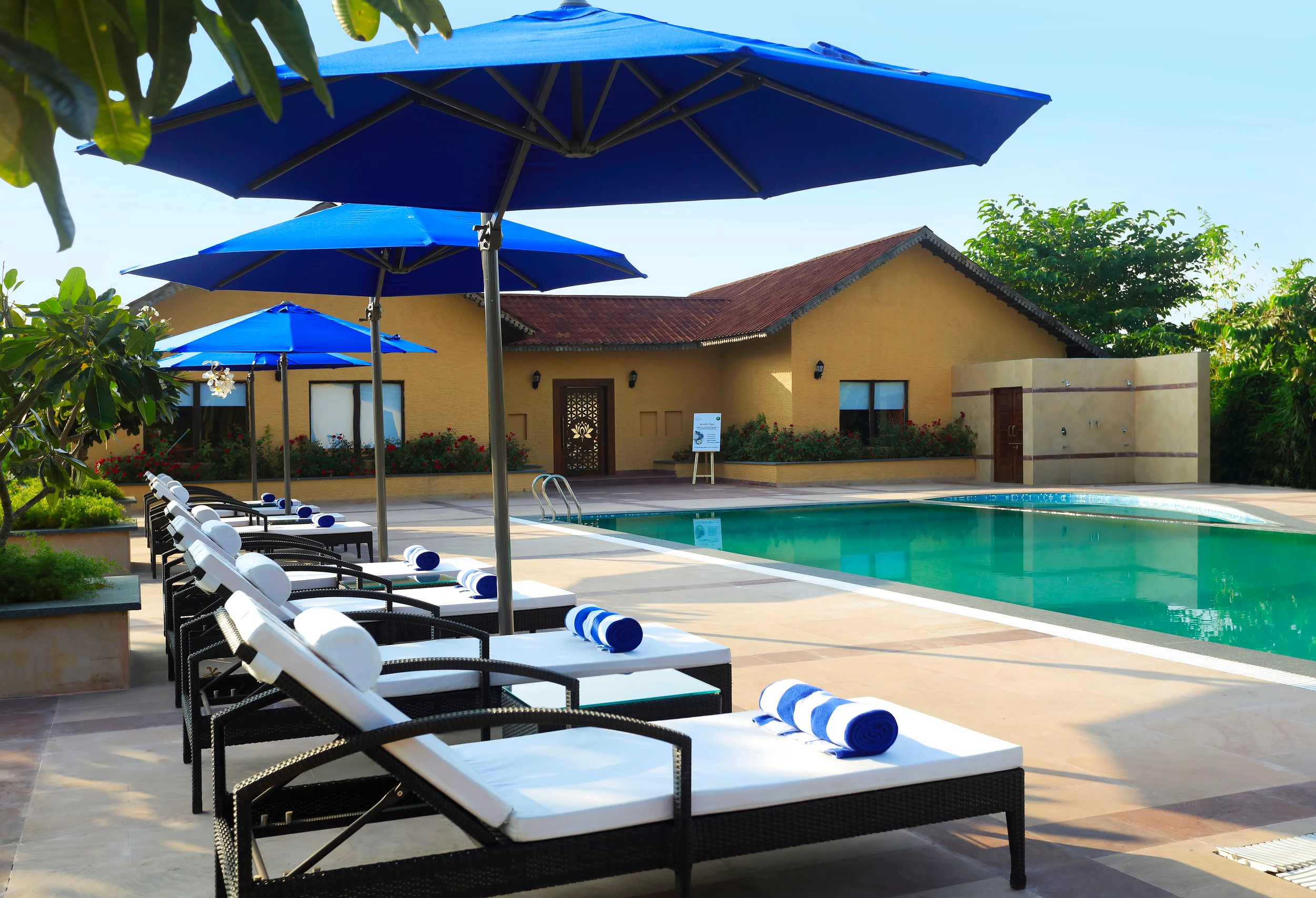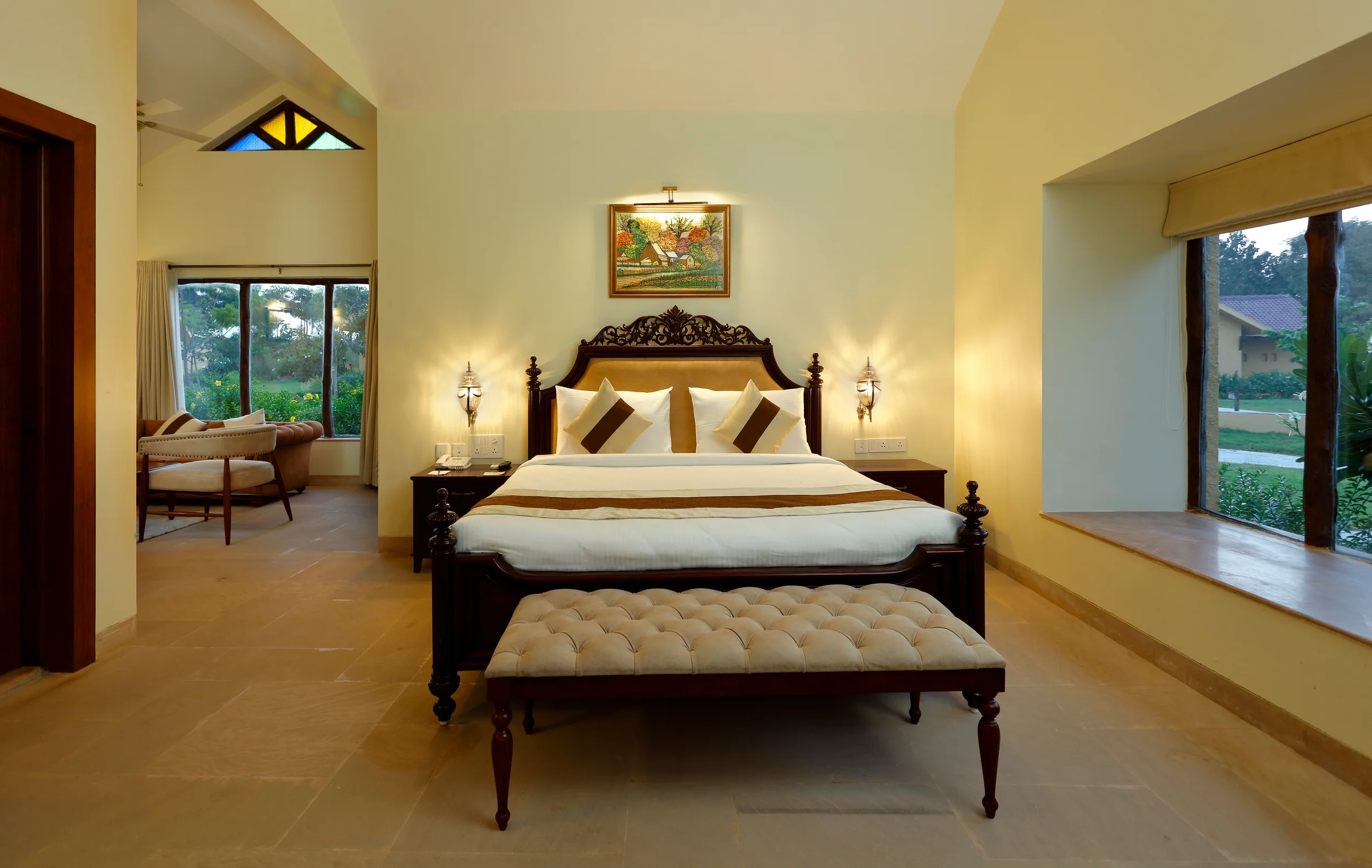 The resort’s 36 rooms, categorized into Premium Cottages, Tents, and Deluxe Cottages, are designed for privacy and scenic views, each featuring private garden spaces. Rustic stone pathways connect the clusters, adding to the sense of seclusion. Interiors feature natural stone flooring, wooden furniture, and subtle fabrics, creating a luxurious yet simple ambiance. Traditional elements like Mangalore tiles, mud-plastered walls, and intricately designed jaalis enhance the heritage experience.